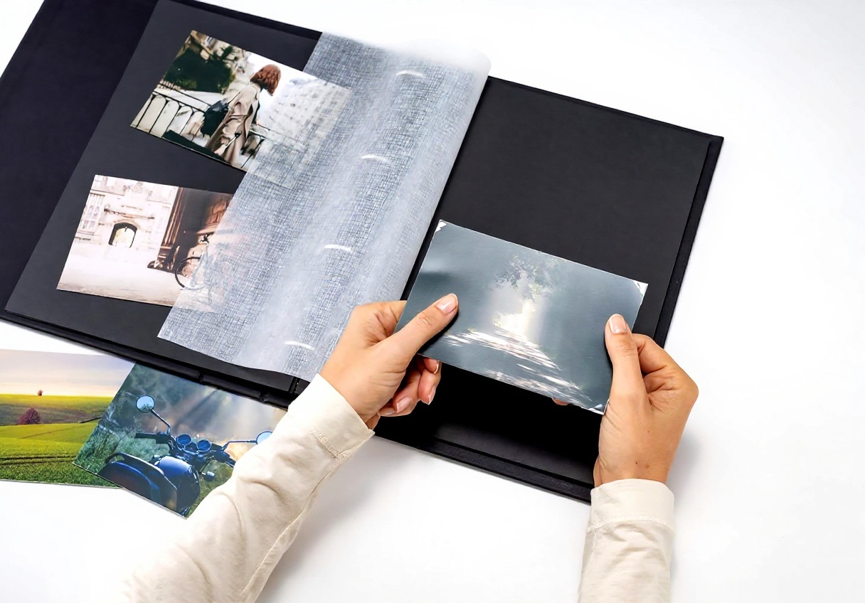 No, l’adesivo è privo di acidi e non lascia residui, garantendo la protezione delle immagini nel tempo.