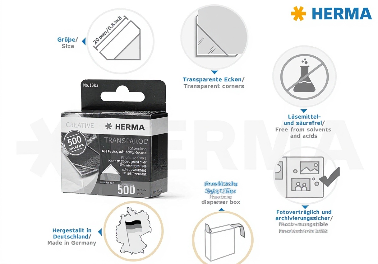 Gli angoli HERMA 1383 sono progettati per formati L-XL, adatti alla maggior parte delle fotografie standard e di grandi dimensioni.