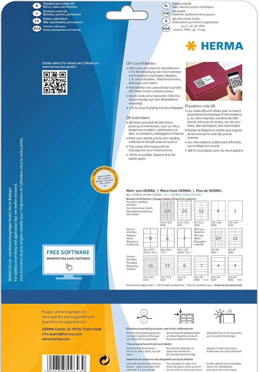 Le etichette universali HERMA sono realizzate in carta opaca bianca, con adesivo permanente per una tenuta duratura. Progettate per una leggibilità ottimale, sono ideali per la scansione di codici QR e l’etichettatura professionale.