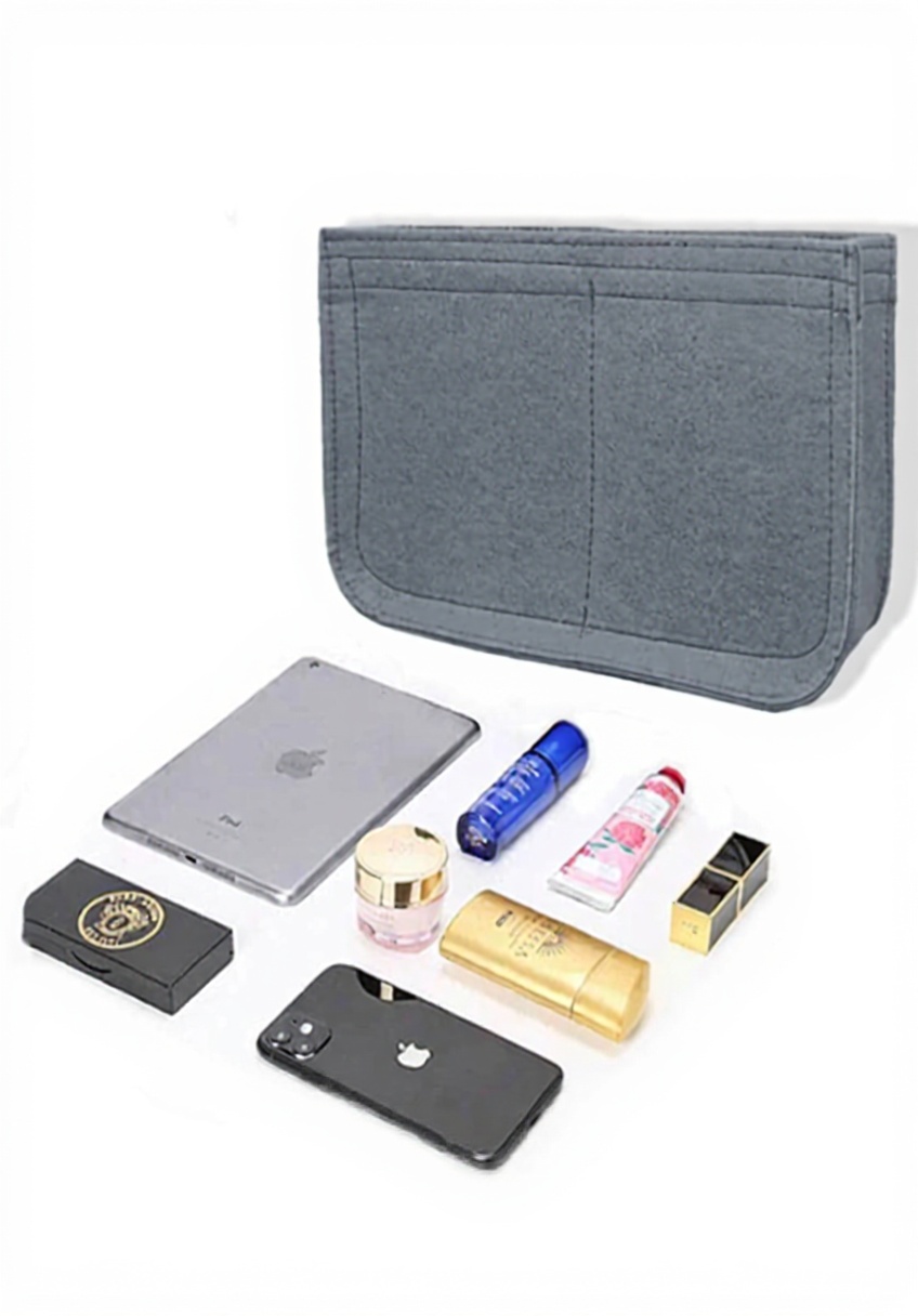 Realizzato in feltro di alta qualità con rifiniture in seta, questo organizer include tasche multiple per organizzare oggetti personali, garantendo una facile accessibilità e una struttura resistente che si adatta perfettamente alla borsa.